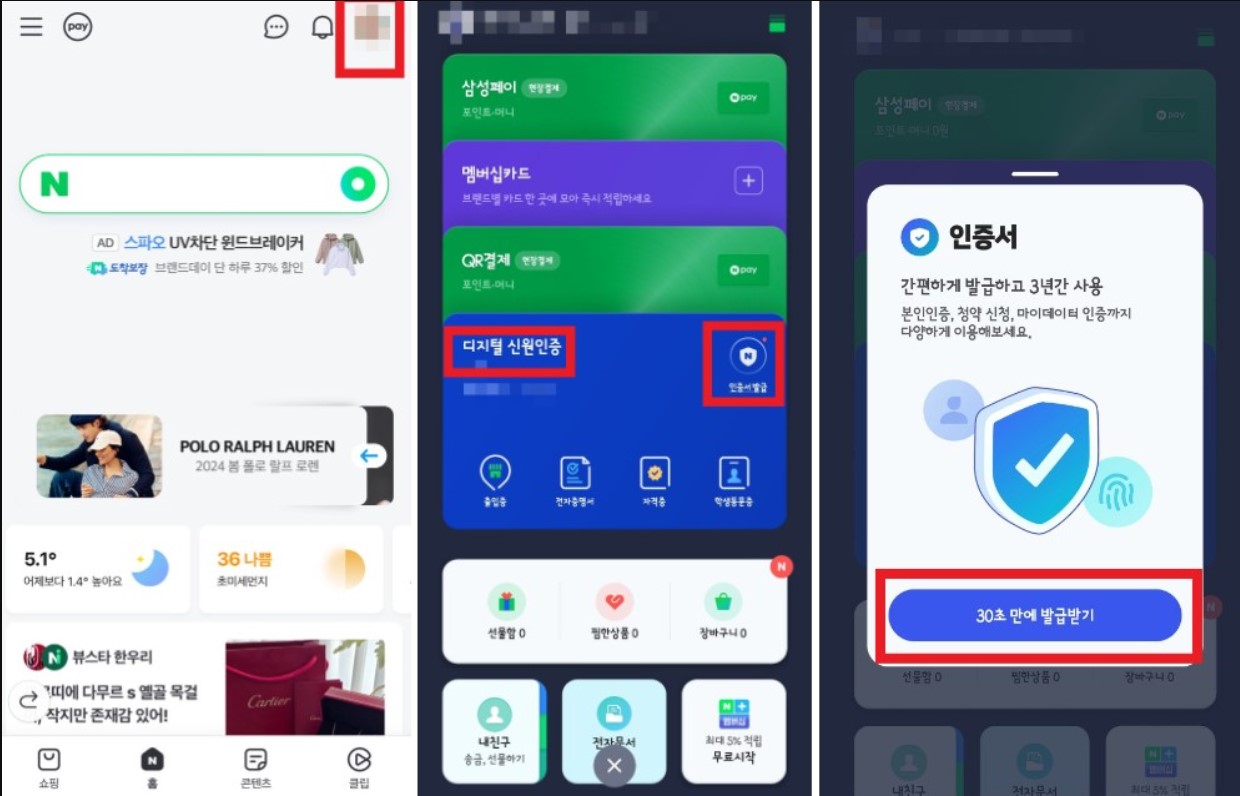 2. 네이버 어플에서 로그인 > 오른쪽 상단 프로필 클릭 > 디지털 신원인증 인증서 발급 클릭 > 30초 만에 발급받기 클릭