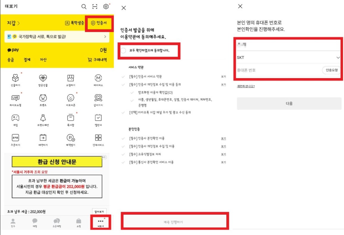 1. 카카오 하단 더 보기 클릭 → 인증서 클릭 → 약관동의 → 본인 명의 인증